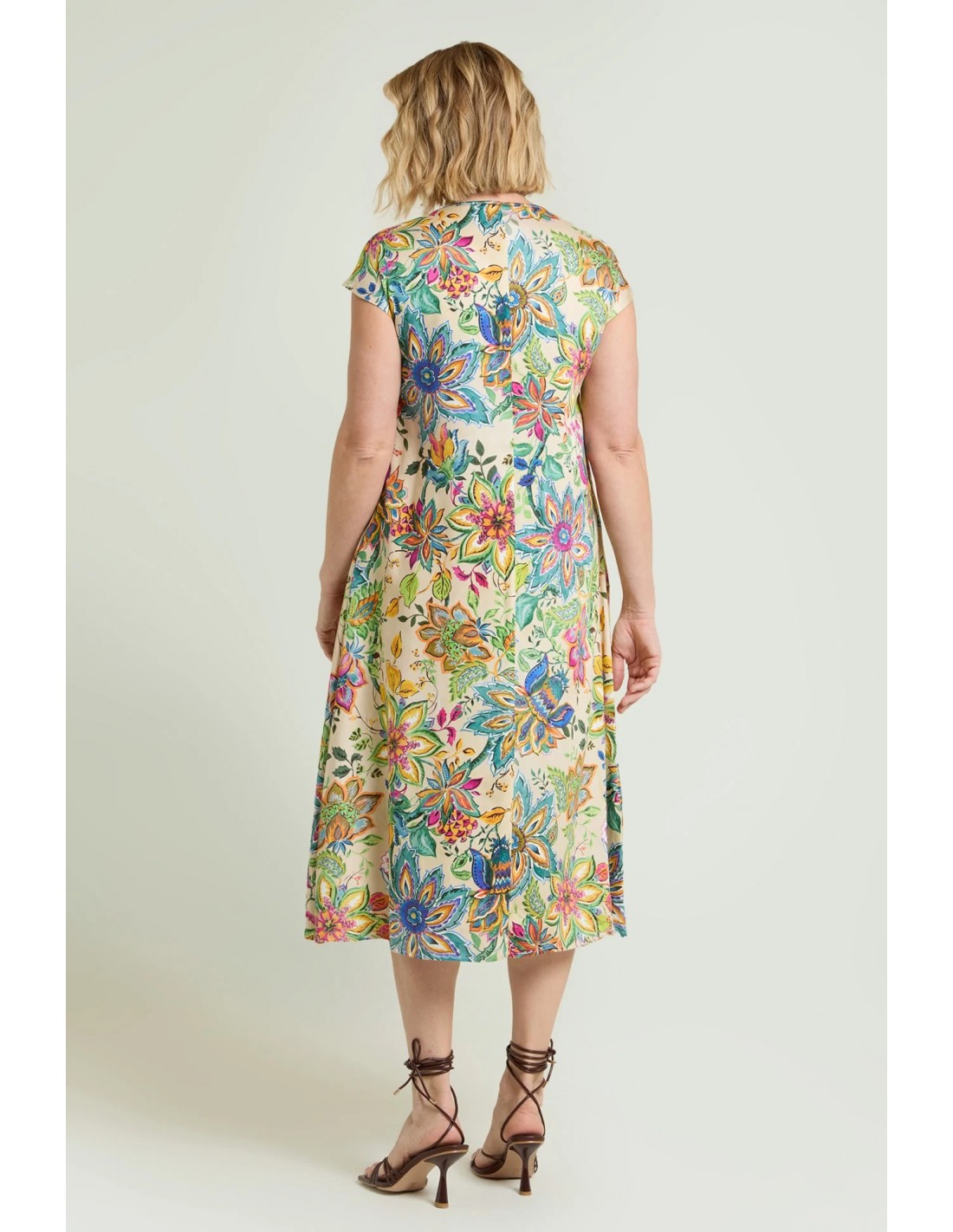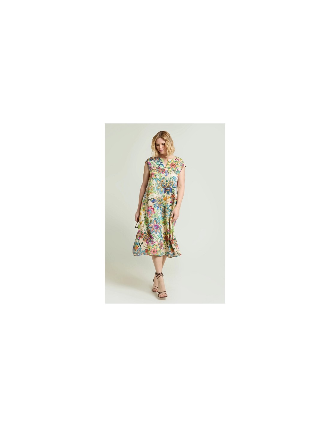 Tg 43(52) Tg 47(56) Abito fantasia in satin stampato dalla linea leggermente svasata. Un disegno floreale dal tratto esotico con mille sfumature in colori diversi. Stampa esclusiva Luisa Viola