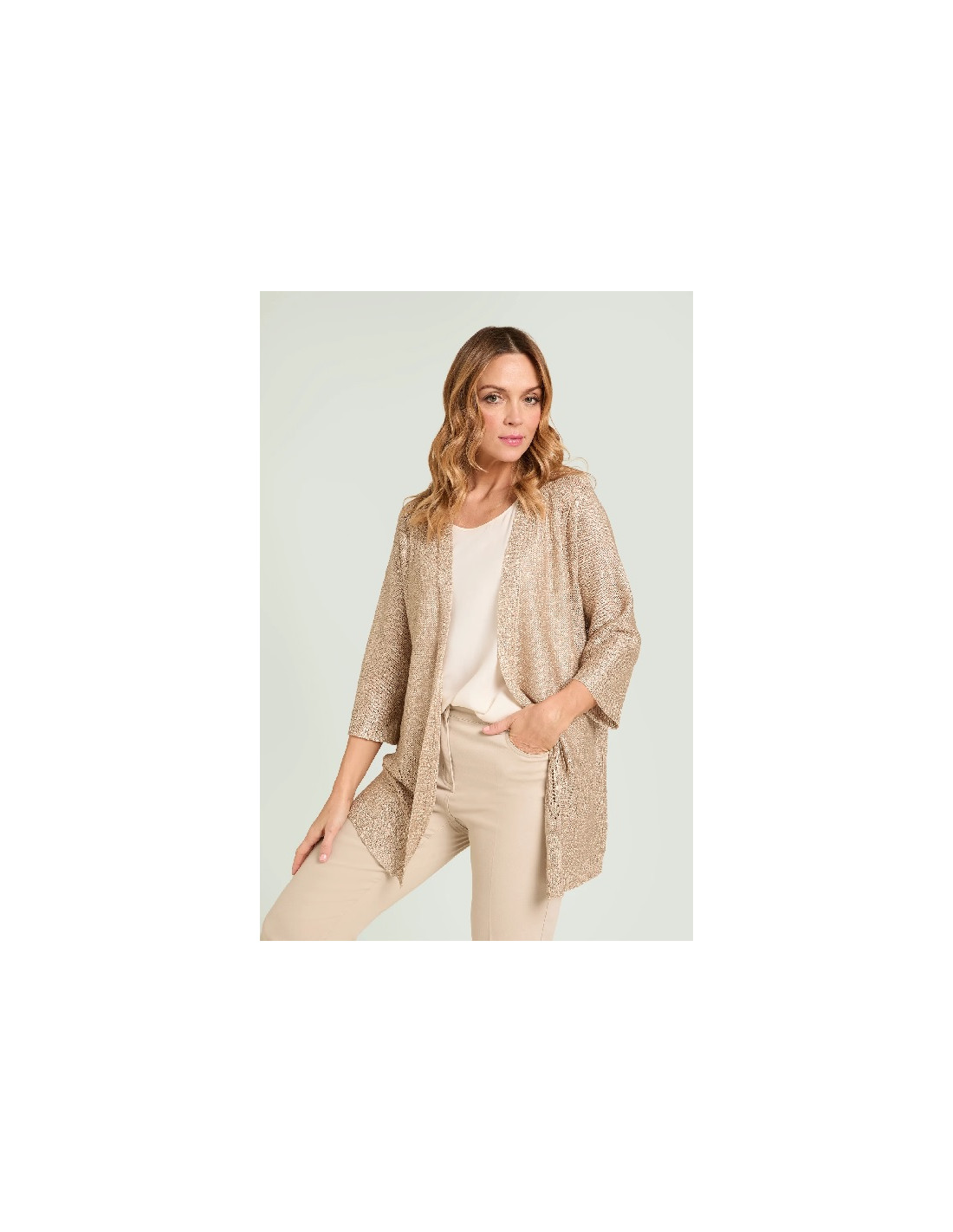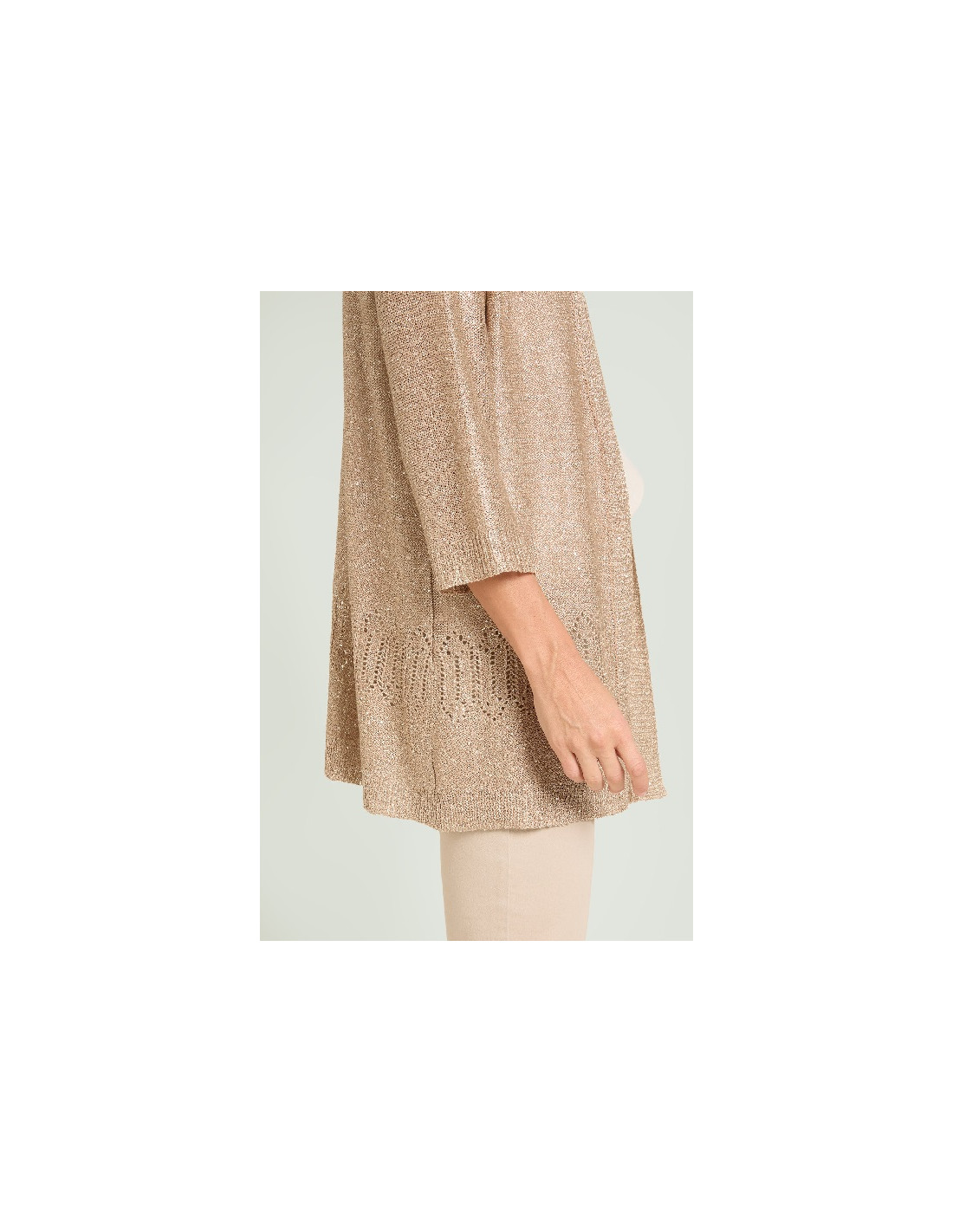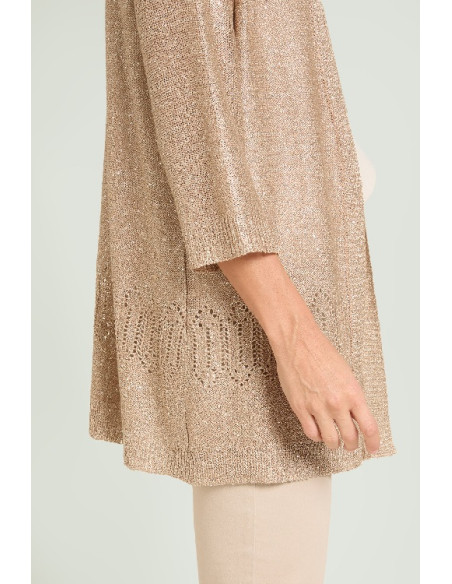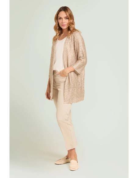 Cardigan in cordonetto caratterizzato da una pioggia micro paillettes trasparenti che donano al capo una luce discreta e preziosa.