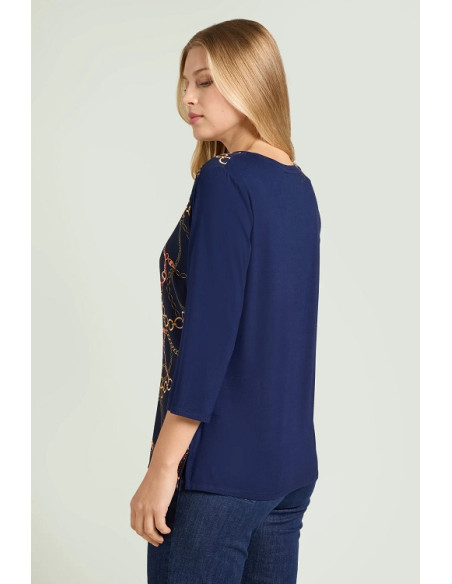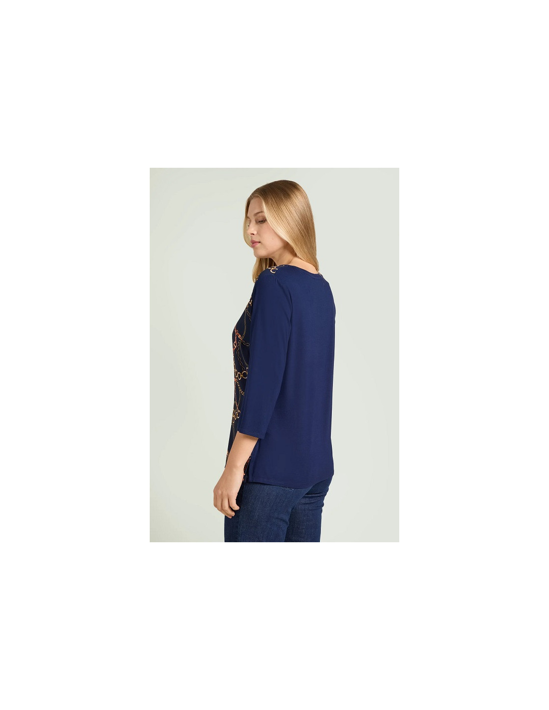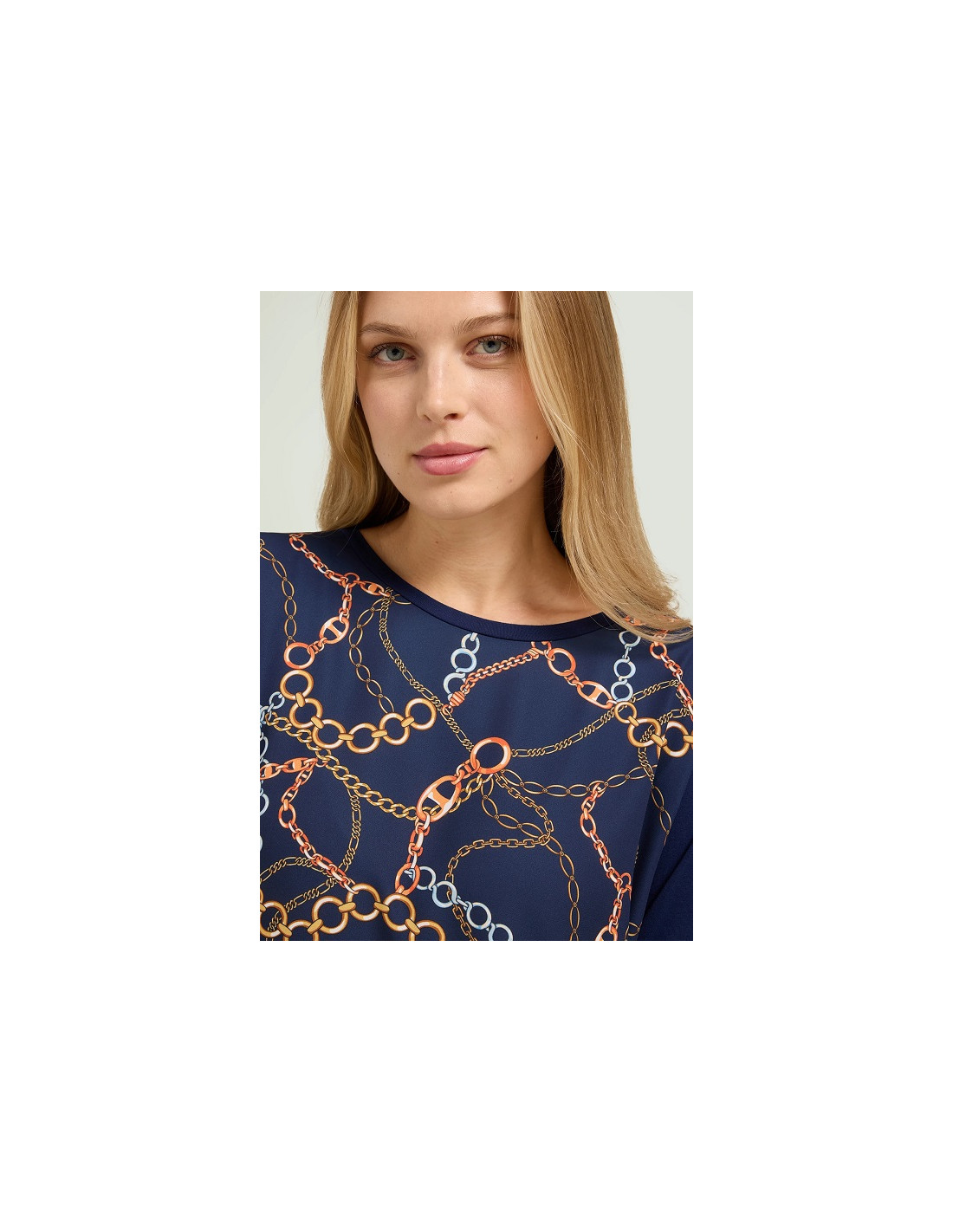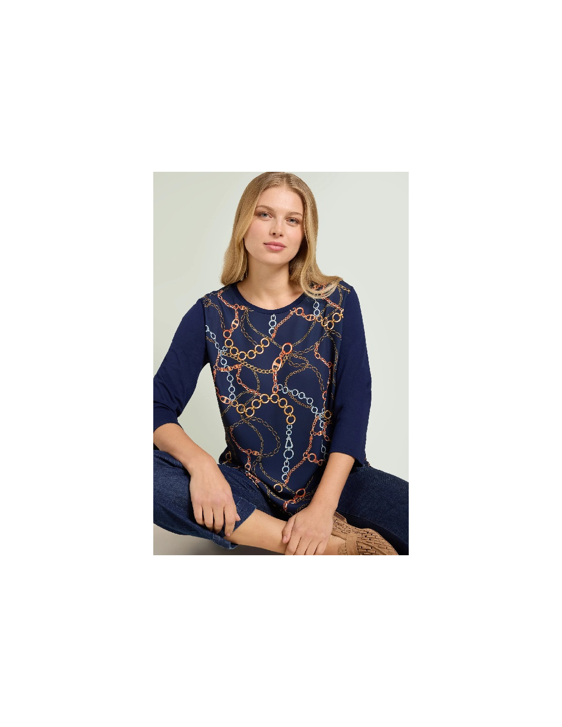 T-shirt in jersey di viscosa stretch con davanti in crepe de chine stampato. Scollo rotondo, manica con lunghezza a tre quarti, spacchetti laterali.