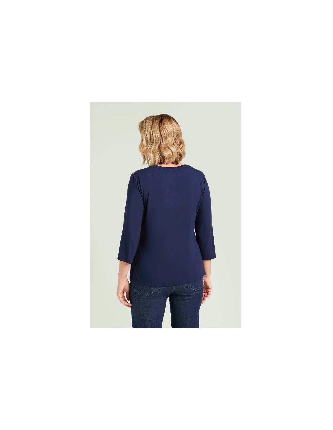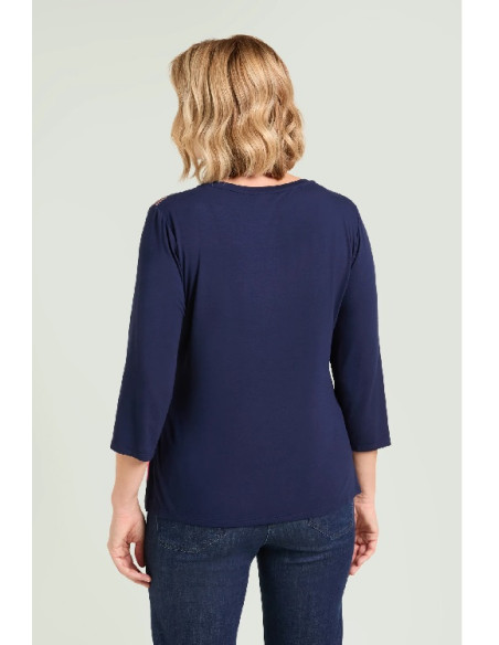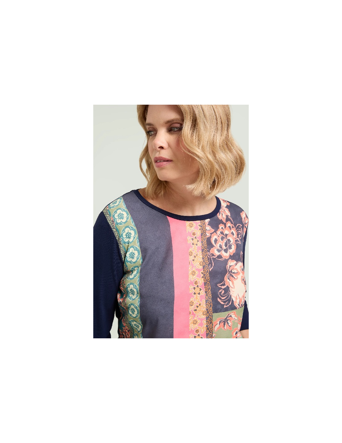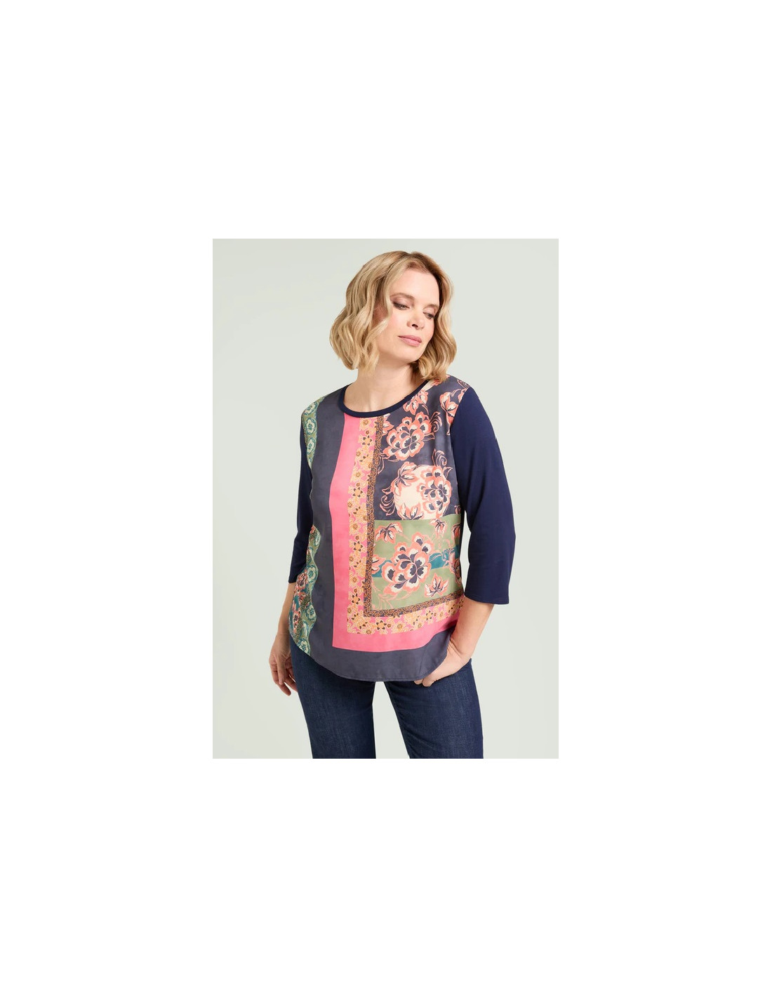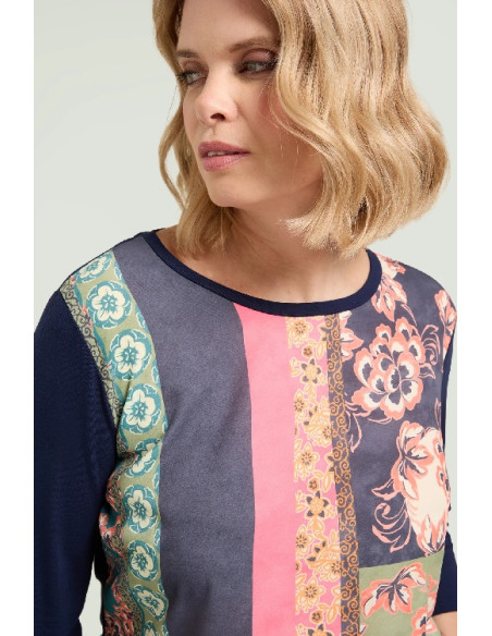 Tg M(50) Tg XL(56) Tg 3XL(62) T-shirt in jersey di viscosa stretch con davanti in crepe de chine stampato. Scollo rotondo, manica con lunghezza a tre quarti, spacchetti laterali.