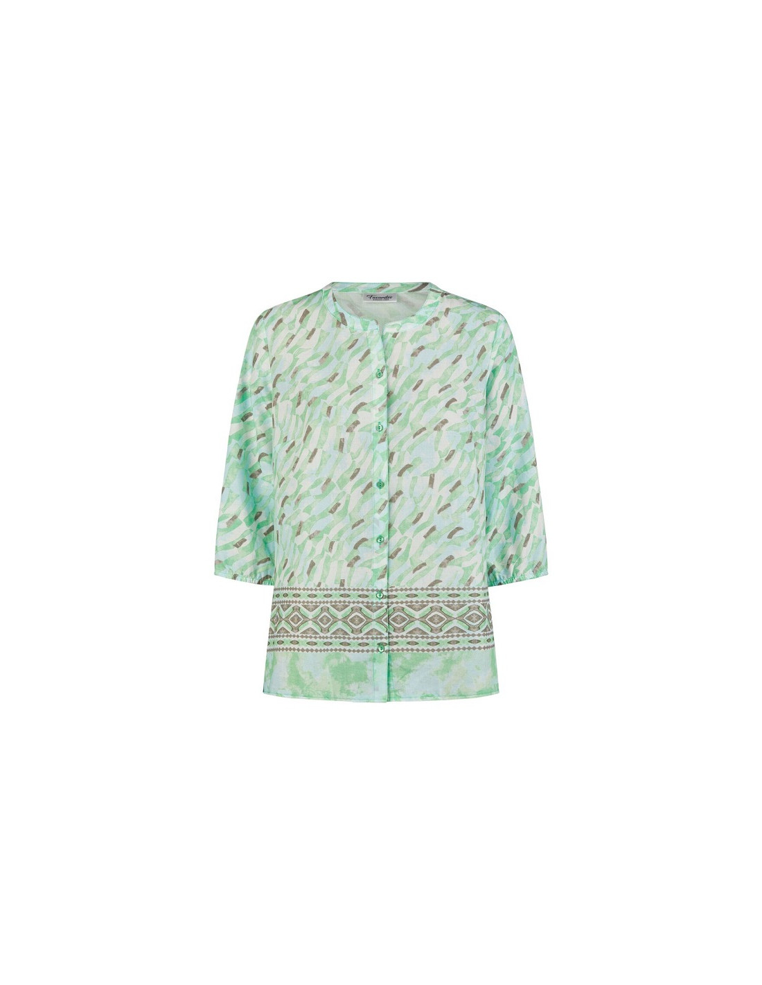 Casacca collo alla coreana interamente abbottonata sul davanti con piccoli bottoni tondi di colore verde acqua, che si mimetizzano bene con la fantasia.