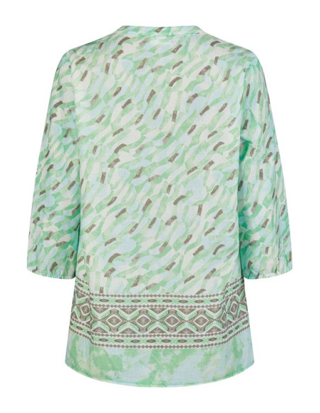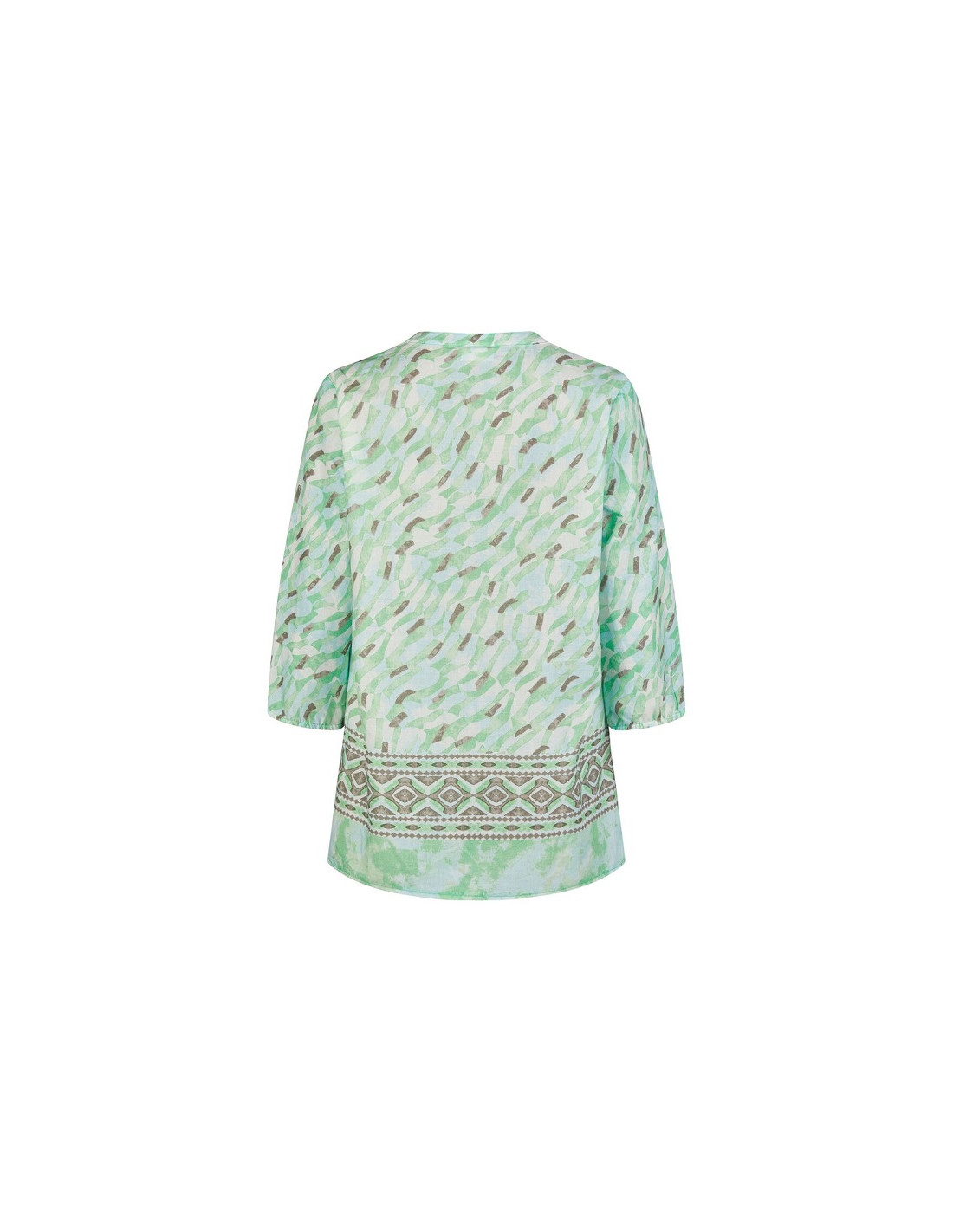 Ha maniche a tre quarti con un leggero arriccio sul fondo, che crea un effetto leggermente a palloncino, molto confortevole. stampa astratta all-over che ricorda pennellate veloci o un motivo zebrato stilizzato in tonalità acquerello.