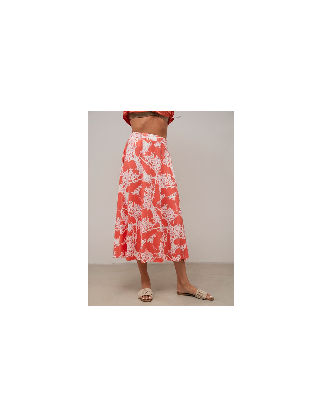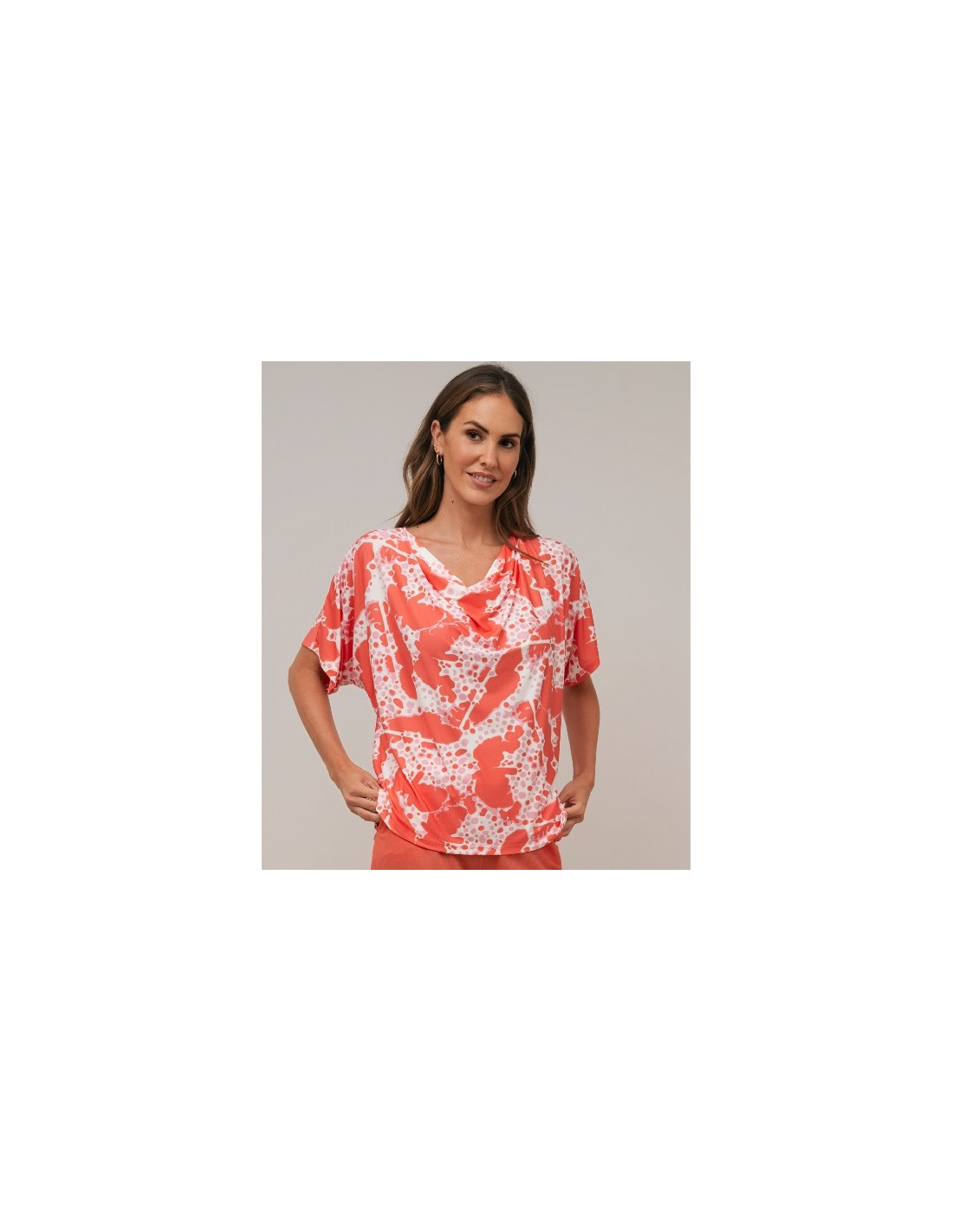 Presenta una stampa astratta molto dinamica che combina macchie di colore corallo/arancio su un fondo bianco. La gonna ha un elastico in vita, per una vestibilità pratica e confortevole, blusa dalla vestibilità ampia e scivolata caratterizzata da maniche corte a kimono molto larghe e un collo morbido drappeggiato (scollo a ciambella). Tessuto in viscosa molto fresco e traspirante
